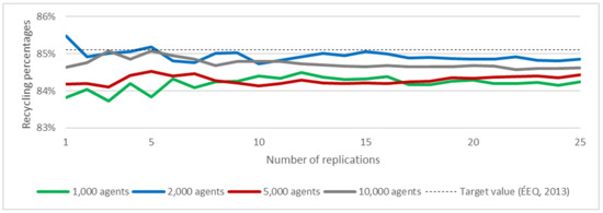 Next, the number of agents needed to be optimized. Figure 5 shows the model stability and validity as a function of the number of replications. Shortly after 10 repetitions, the simulations with 10,000 agents begin to show stable results. However, the simulations with only 2000 agents seems to be the closest to the target value but are less stable.