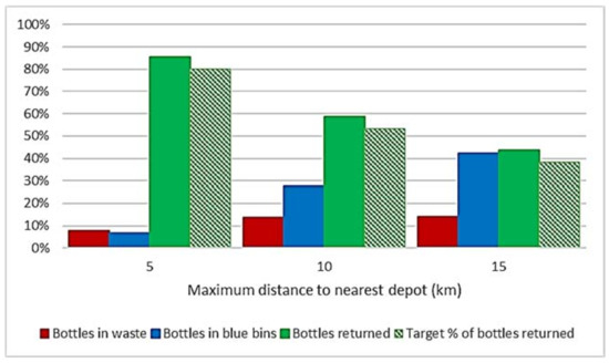 Compared to the empirical data there is an average difference of +5% and +9%, respectively for the 0.15$ [48] and 0.35$ [54] deposit fee scenarios, with the percentages of consumers bringing back their bottles to depot centers in the simulations and in the surveys. However, it must be noted that the empirical data for the 0.35$ deposit value was from a survey that did not specify any distance that would need to be traveled to reach the depot center. Therefore, the target value was the same for each scenario. Nevertheless, the logic that the distance affects the intention to bring back can be seen in both experiences, which greatly contributes to the difference between the simulation results of the 0.35$ deposit value and the empirical data.