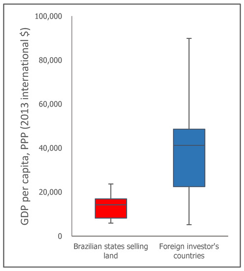 Distribution of Gross Domestic Product (GDP) per capita at purchasing power parity (PPP) rates in the states of Brazil where land is purchased by foreign investors and in the foreign investor’s countries.