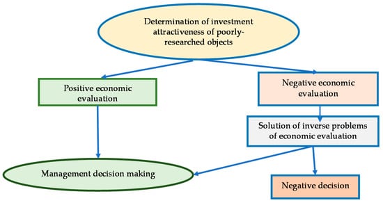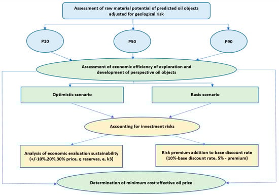 Figure 3). The results of economic calculations can be either positive or negative. If negative results are obtained, the solution of inverse problems is required to determine the limiting geological and economic characteristics (the minimum volume of profitable oil reserves, the minimum acceptable level of oil prices, etc.), at which the economic evaluation of the object becomes positive. If, for example, the development of a hydrocarbon raw materials object becomes effective at an oil price that does not significantly exceed the level accepted in the calculations, then the investor can make a positive decision about initiating exploration and subsequent development based on the projected expectations of a higher world oil price.