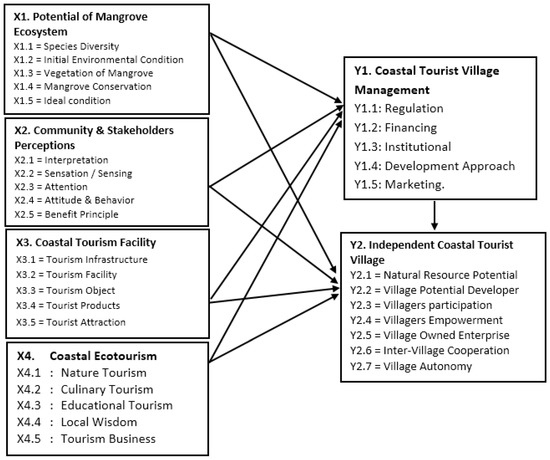 Based on this model, it could be stated that independent village of coastal tourism could be directly pursued through the management of good coastal tourist village (because the Y1 variable was a good moderator). Furthermore, the management of coastal tourist village was strongly influenced by the perception of coastal tourist communities and coastal ecotourism. Therefore, these two variables also indirectly affected the independent villages of coastal tourism through the management of coastal tourist villages. In another sense, the management of coastal tourist villages became a strong mediator between community perceptions and coastal ecotourism in realizing an independent village of coastal tourism. Management of the coastal tourist village became an important variable, the decision of the management of a sustainable tourism destination will be successful if there is political support and sufficient planning from decision-makers. It is supported by the results of a studies from Reference [29].