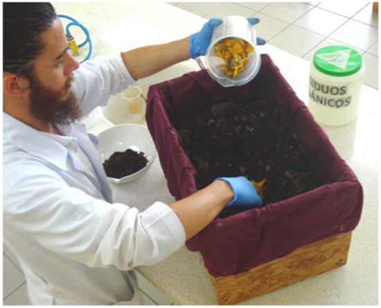 A small plastic container with an airtight lid was placed in each cafeteria to collect food waste. This small container was located next to the container for ordinary non-compostable waste. At the end of each day, in the cafeteria sink, an operator selected the waste collected in each small container by hand, chopped it, incorporated it into the TCB, and mixed all its content (Figure 1). The two boxes were fed only by one person in each facility from June to December 2015. Mature compost was obtained as follows: every three weeks, the waste that exhibited homogeneous appearance (compost) and a dark color was removed to plastic bags. The compost in opened plastic bags was left to mineralize for another three weeks, after which it was ready for chemical analysis. Special attention was given to detect the advantages and disadvantages of collecting and processing the food waste as mentioned before.