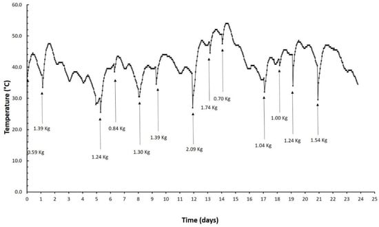 Each time the waste was added, the composting system was homogenized (aerated) completely. Therefore, minimum temperature values were observed whenever food waste was added (see the arrows below Figure 2). Peak temperatures were observed within one day after the addition of new material. As more consecutive days passed and a greater mass of waste was added to the TCB, higher temperatures were reached. This was observed from days 12 to 15 and 17 to 20, which had the highest consecutive amounts of waste. Each time food waste was added, the temperature exceeded 45 °C within a few hours after the addition. This condition favored thermophilic microorganisms and the possible inactivation of some pathogens. However, in agreement with Gajalakshmi and Abbasi [29], all pathogens would be destroyed at approximately 60 to 70 °C. When no waste was added, after a peak in temperature, the temperature gradually dropped off as the degradation rate of organic matter decreased [29]. These authors showed that this phenomenon results in the adequate stabilization of organic matter and drying of the compost, in addition to contributing to the diminishment of the pathogens burden. Unfortunately, in the present study, no pathogens determination was conducted. Therefore, considering that the higher temperature in the TCB was 54 °C and that international regulations [30] establish a compost temperature above 55 to 60 °C to eliminate pathogens, further research on this aspect is recommended.