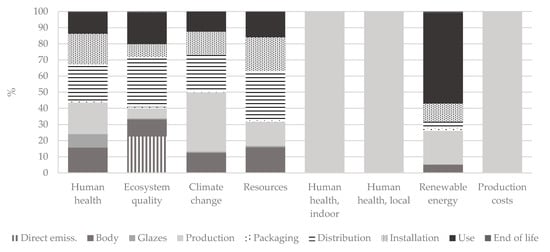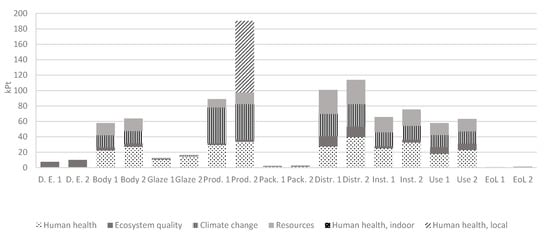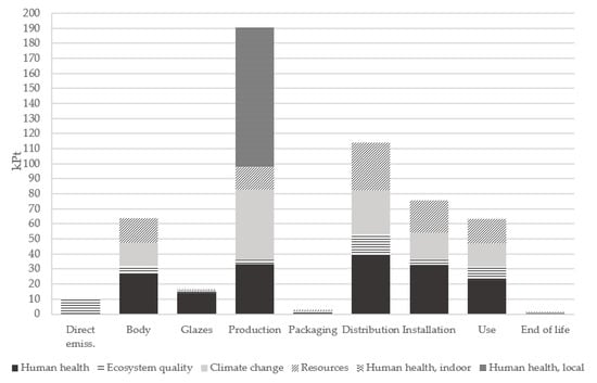 The assessment of the glazed porcelain stoneware tiles life cycle has been carried out with IMPACT 2002+ []. This method has been chosen for the reason that it proposes a combination of a midpoint and an endpoint approach; the former reduces the degree of uncertainty but may be less helpful in decision making than the latter. All midpoint scores are related to the four damage categories Human health, Ecosystem quality, Climate change and Resources. Furthermore, normalization can be performed either at the midpoint or at the endpoint level. IMPACT 2002+ method has been modified considering both the midpoint level and the endpoint levels. In order to use a more representative index of the system considered and to take into account some shortcomings and limitation of the method, the authors have implemented the following modifications []: