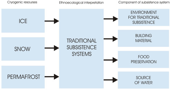 The research hypothesis considered cryogenic resources including their interpretations within the context of the ethnoecological studies as components of the traditional subsistence systems of the different people and ethnic groups (Figure 1).