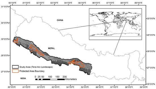 The Terai Arc Landscape (TAL) of lowland Nepal was selected as the study area (Figure 1) as it is a region of very high ecological importance that has experienced rapid LULC changes in the recent past and is exposed to ongoing land use pressure []. The landscape was introduced by the Government of Nepal in 2001 as the TAL program and is located in the southernmost part of Nepal. It stretches over 18 districts, within which six protected areas are located. TAL is also a region with high pressure from infrastructure development, population migration and urbanization. The climate of the TAL region ranges from tropical to sub-tropical with maximum daily temperature during the summer months of around 35 °C. The rainy season between June and September is characterized by heavy downpours and often results in severe flooding. TAL is among the most agriculturally productive areas of the country and is characterized by a mosaic of different land use dominated by agriculture and forests.