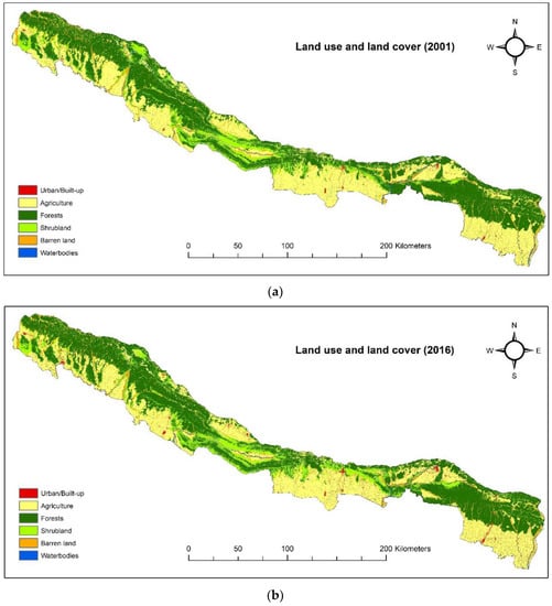 LULC for 2000 (a) and 2016 (b) of Terai Arc Landscape, Nepal.