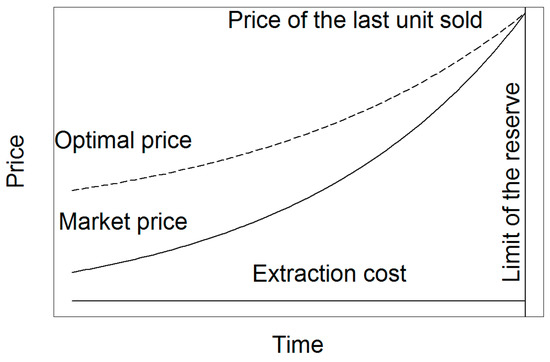 The Hotelling rule of exponentially increasing the price with time applies only to the scarcity rent component of the resource price (i.e., the net price, difference between the price and the extraction cost) and only with zero or constant extraction cost and a finite stock of a resource. In this case, the correction of the market price follows the same method as mentioned above, but based on the net price. The optimal net price is equal to the optimal price minus the extraction cost. Figure 2 shows the price correction with constant positive extraction costs.
