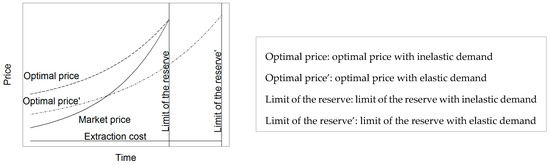 Under the common assumption of decreasing intratemporal marginal utility of consumption [15], the demand curve for the resource is elastic, so that a rise in price lowers the demanded quantities. The agents facing or expecting the optimal “corrected” price will consume less of a resource annually than if they were facing a lower, non-corrected price. So, the correction lowers the demand and extends the time before depletion. As the price of the last unit sold is equal to the maximum opportunity cost of the resource, the optimal price of the resource will not rise higher than this level. At the equilibrium, this situation will be anticipated and the prices will drop at each period of time. Eventually, the optimal “corrected” present price will stabilize at a level somewhere between the present market price and the optimal price under inelastic demand (see Figure 3). The higher the demand elasticity, the lower the socially optimal price.
