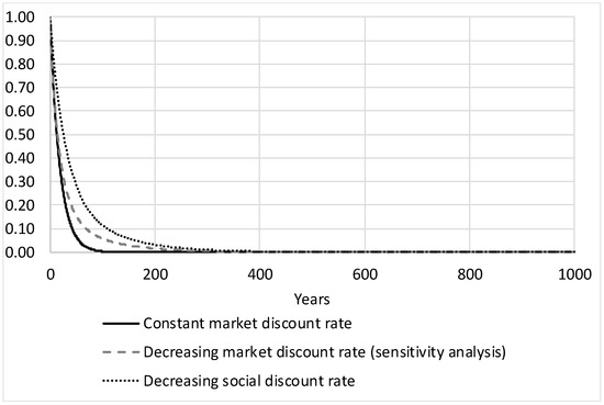 Given that the future growth rate is uncertain, the certainty-equivalent social discount rate will decrease over time. There is general agreement (Arrow et al., 2012, 2013 [18,19]) that “uncertainty about future discount rates provides a strong generic rationale for using certainty-equivalent discount rates that decline over time” (Weitzman, 1998 [20]). Accordingly, we apply a hyperbolic declining social discount rate over time. We apply social discount rates based on the starting value of 3% of the Green Book (2008) [21] rates used in the UK, with the equiprobable interest rate scenarios of Weitzman’s declining certainty-equivalent discount rate model varying from 1% to 5%.