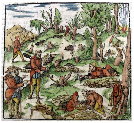 Unfortunately, it is not true, at least not in the time scale that is relevant to mankind. Thus, the search for the rare resource deposits has always been a great challenge to mankind. In this search, a variety of means has been employed, such as divining rods, which were already graphically demonstrated by the great German mining expert Georgius Agricola (1494–1555) (Figure 1). It was also Agricola who cited the critics of his time and described the environmental impact of mining and smelting: