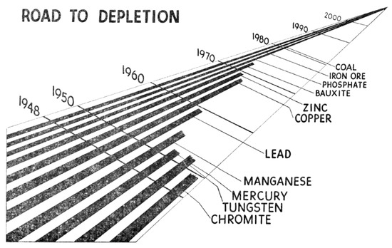 The scarcity and availability of resources was then repeatedly addressed, e.g., with the “Road of Depletion”, which was presented in a hearing of the U.S. Senate 1949 by James Boyd, the director of the U.S. Department of Mining (Figure 2) [21]. At that time, it was already very clear that only 7% of the world’s population, namely in the U.S., use 50% of the world’s minerals and 70% of the world’s oil. The U.S. president installed a Materials Policy Commission, which in 1952 submitted a major report titled “Resources for Freedom” [22]. The Cold War was also a contest for economic power and access to natural resources. In 1963, a large systematic empirical study by Barnett and Morse of historic trends for various natural resources between 1870 and 1958 eventually supported the hypothesis of a decreasing (rather than an increasing) scarcity [23]. They represented a critical but nevertheless optimistic picture of the resource question. They believed in technical progress and in raising efficiency.