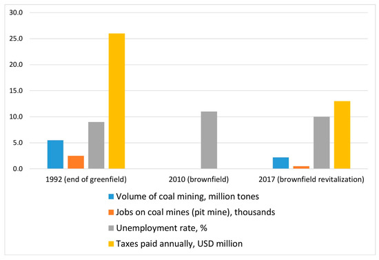 - Golofastova, N.N.; Mikhailov, V.G.; Seredyuk, I.V. Transformation of ecological-economic system of coal mining region. Econ. Innov. Manag. 2017, 66–75. [Google Scholar] [CrossRef]