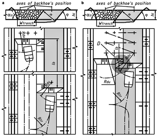Technological scheme of heterogeneous layers development at Kiselevsk City Coal open pit mine: (a) separate excavation by simple face on rock-and-coal panel; and (b) complex face. m—the seam capacity; Wtrench—the width of the working trench; hl—the layer’s height; Rdu—the radius of scooping; Rtr—the radius of dump truck turning; lb—the length of the coal block being excavated.