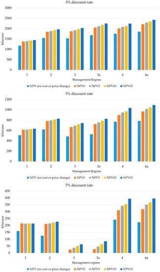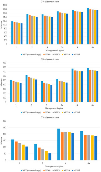 | Number of Thinnings | Harvest Age (years) | Discount Rate | NPV no Cost Change ($/ha) | NPV0 a w/Cost Change ($/ha) | NPV5 a w/Cost Change ($/ha) |