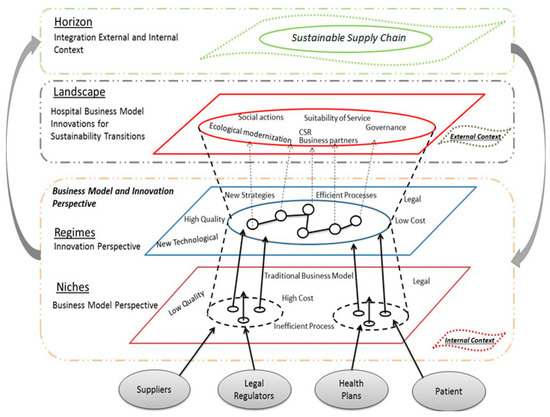 On the other hand, evaluating the sustainable transition level that the hospitals must cover, not only should the questions of the new technologies, practices (clinics) or management be included, but rather should focus on the business models to promote the sustainability [74] and share actions in a larger supply chain like the SSC. One of the main challenges in the hospitals is to ensure the success of a business model, combining it with a wider scope, that is, in the perspective landscape. In the landscape dynamics, the gain is larger and more comprehensive, generating environmental [9], social [32,62], economic [46], quality [75], strategic [14,76] and technological [76] benefits to provide a new multilevel horizon that works collaboratively [77].