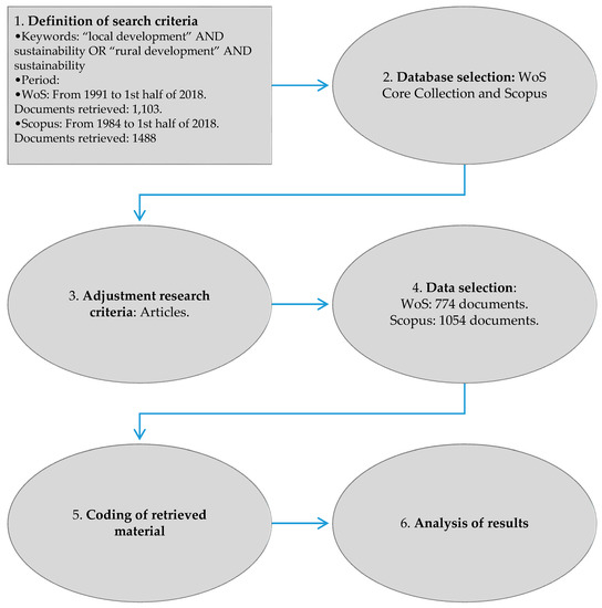 Regarding the definition of the search criteria, keywords and period, “local development” and “sustainability” and, on the other hand, “rural development” and “sustainability” have been searched on the databases. The emergence and use of the two terms as synonyms by agencies such as the World Bank or the United Nations Department of Economic and Social Affairs (UNDESA) [79] has led to use a double root of the concept into local and rural.