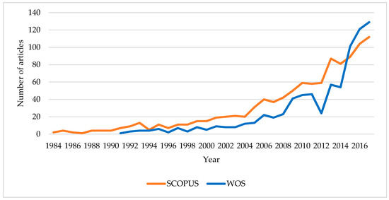 The study period coincides with the registration of articles in each of the databases. For WoS this starts in 1991 and ends in the first half of 2018. For Scopus, the period runs from 1984 to the first half of 2018.