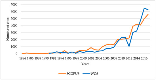If we compare the evolution in the number of articles and citations in each database, it can be seen that throughout the period in question, the Scopus database contained a greater number of entries than the WoS database until the year 2015, when the trend was reversed.