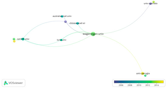 The reason for this is found in the geographical concentration of WoS institutions versus those included in Scopus. While the former includes European institutions (with the exception of the University of California, USA), Scopus also covers South America and Asia. In addition, its research focus also includes the only Spanish-speaking institution, the University of Zulia (Venezuela). These results are therefore consistent with those obtained in the distribution by country analysis, with institutions in the United Kingdom, the Netherlands, the United States and China being particularly noteworthy. On the other hand, the cluster analysis shows that Wageningen University & Research is the main centre of SLD studies, while the universities of Perugia (Italy) and Florida (United States) have been spearheading the latest trends since 2016 (Figure 4). In addition, the prevalence of Dutch and Chinese institutions is perfectly in line with the high level of participation in the agriculture and environment themes presented in the corresponding sections.