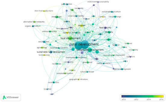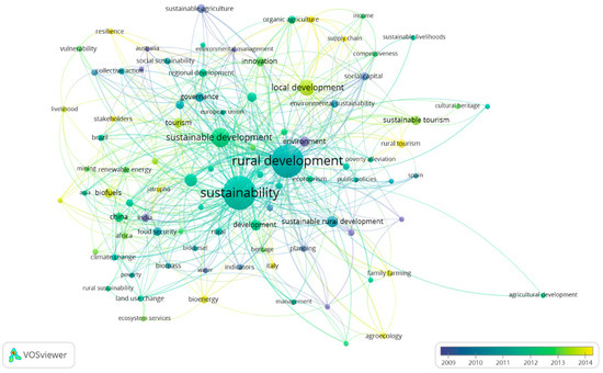 A fractional counting is conducted to identify which terms are most commonly used and which trends are currently shaping new aspects of SLD studies. For this purpose, the study is based on trend graphs produced by VOSviewer (version 1.6.10, Leiden University, Leiden, The Netherlands), where a gradual scale of colours indicates the novelty of the term: purple pertains to concepts from the beginning of 2010 and yellow corresponds to the final study period. In both databases the terms sustainability and rural development are the most prevalent in SLD articles (Figure 6 and Figure 7).