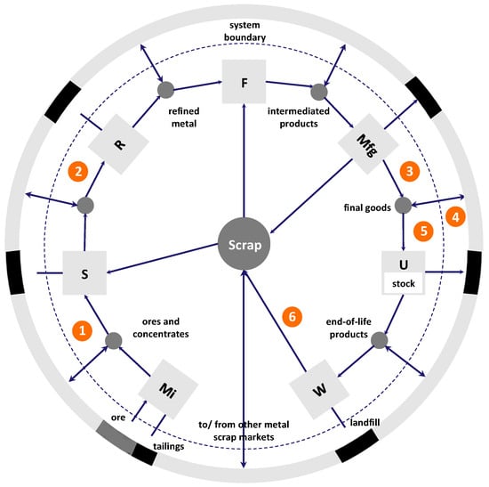 Several circled numbers representing metal flows were added to the Figure 1 generic cycle in order to discuss the potential for country-level circularity. Flow 1 represents the flow of metal concentrate, which results from a comminution process that crushes metal-containing ore and performs a rough separation of minerals from gangue by froth flotation (concentrate is the form of a mine’s output most often imported or exported). Flow 2 represents the flow of impure metal, from which the anions present in the minerals have been largely extracted in the smelting process, followed by refining the metal to purity, fabricating semi-products (sheets, rod, etc.), and product manufacturing. Flow 3 is the outflow of the target metal in domestically manufactured products. This can be added to or subtracted from flow 4, the amount of the target metal in imported or exported products. Flows 3 and 4 combine to provide the magnitude of flow 5, the amount of the target metal flowing into domestic use. Flow 6 is the domestic recycled flow fed back into the domestic material flow cycle; as Birat [14] notes, it is an extremely challenging step for many metals. However, for a system to completely satisfy circularity for a target metal, flow 6 must be equal to flow 5.