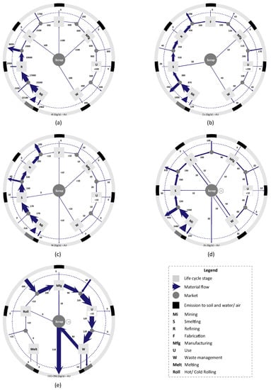 Figure 2 makes it apparent that Australia is far from being a circular economy so far as metals and alloys are concerned. However, Lane [7] pointed out that the appropriate geographical scale for a circular economy is open to discussion. Within its national boundaries, Australia is active in the first stages of most metal life cycles, has a modest manufacturing capability, and possesses the potential for recovery and reuse at the end of product life [18]. That product life could be enhanced by designing for more efficient maintenance [19], refurbishment [20], remanufacture [21,22,23], and reuse, as well as cascading uses as an alternative to discard and improved separation [24]. Such actions would not help to circularize the Australian metals cycles, but would result in lowering the metal flow in imports to the use stage.