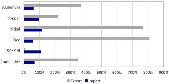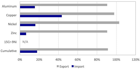 In Figure 3, the embodied energy in trade allocated to the targeted materials production is reported. Overall, greater embodied energy results in exports than imports for aluminum (90% and 15%, respectively), copper (96%, 43%), nickel (103%, 16%), and zinc (90%, 6%). In absolute terms, the cumulative results for the five materials follow those for aluminum, which is a main driver of energy embodied in trade for Australia due to the primary role of Australia in the global value chain of this metal and the relatively high energy requirements per unit of virgin aluminum processed. This trend becomes more evident if the embodied energy is compared to consumption (i.e., flow into use) rather than production (Figure 4). In this case, the energy embodied in exports of nickel and zinc is up to 8 times greater than that attributable to the amount of material consumed in Australia. For aluminum and copper, the energy embodied in exports is between 2 and 4 times that associated with the flow into use. For stainless steel 15Cr-9Ni, the entire flow into use in Australia is imported, with only a relatively small fraction of this alloy (5%) being exported in finished goods.