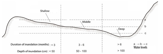 - Shallow swamp or embankment (Lebak pematang): Land on a natural levee with relatively high topography and a shallow or short inundation.