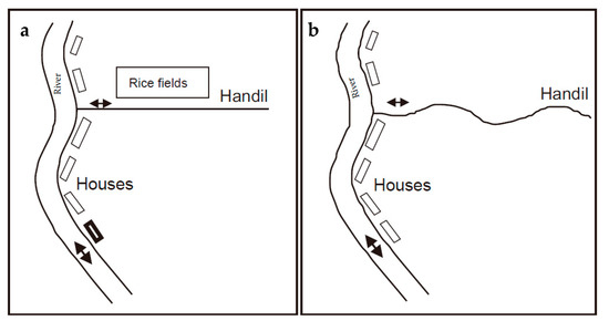 Handil shape or model of the Banjar people (a) and Bugis people (b), which can be found in Kalimantan and Sumatra swamps. Based on Reference [16].