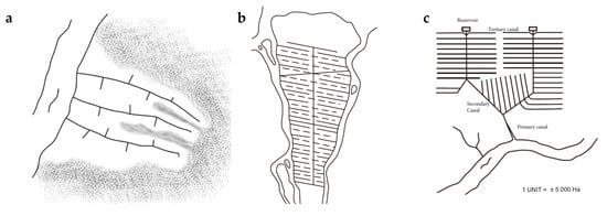 Figure 6. Canal design in tidal lands: (a) Indigenous system; (b) fork system; and (c) comb system. Based on Reference [23]. - The comb system, a rectangular grid without a reservoir.