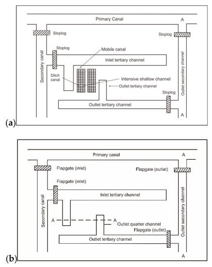(a) One flow direction water management system for tidal land class A and B and (b) tabat water management system for class C and D (based on Reference [31]).