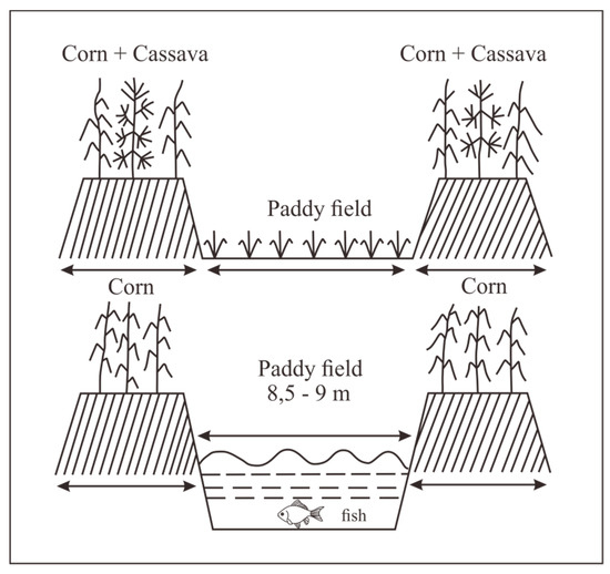 The surjan farming system. Top: Corn + Cassava and paddy field system, Bottom: Corn and paddy field intercropping (Source: Reference [34]).