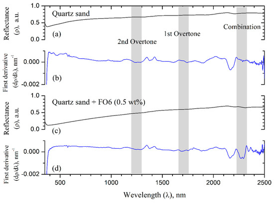 (a) Fuel oil 6 spectral signature of pristine quartz sand. (b) The first derivative of the diffuse reflectance spectra shown in (a). (c) Fuel oil spectral signature of quartz sand spike with 0.5 wt.% on gravimetry bases. (d) The first derivative of the diffuse reflectance spectra shown in (c).