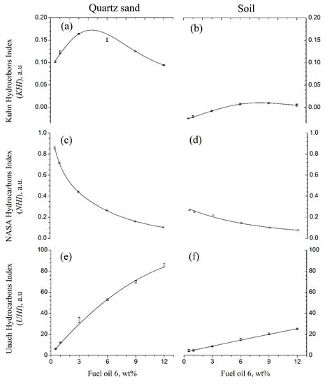 Hydrocarbon index values in quartz sand and soil samples spiked with fuel oil 6 at a concentration of 0.5, 1, 3, 6, 9, and 12 wt.%. (a,b) Khun hydrocarbon index (KHI). (c,d) NASA index (NHI). (e,f) Unach index (UHI).