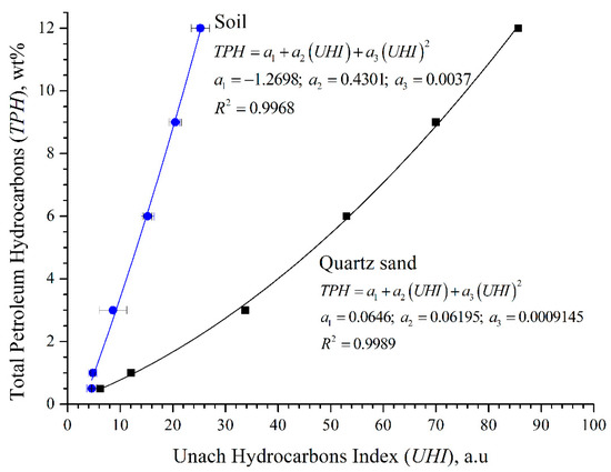 The Unach hydrocarbon index (UHI) and the total petroleum hydrocarbons (TPH) were calculated following the procedure reported by García et al. [20]. The UHI and TPH values were calculated using the equations in row 4 in Table 3 and Equation (1), respectively.