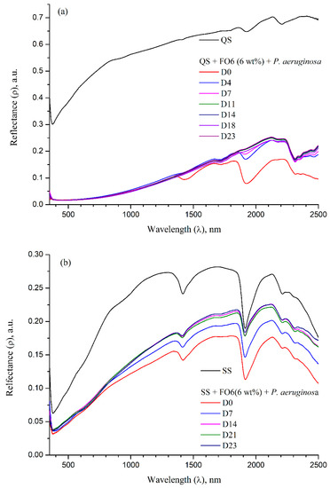 Diffuse reflectance spectra of Quartz sand (a) and soil samples (b) spiked with FO6 and inoculated with Pseudomonas aeruginosa on day 0 (D0). Diffuse reflectance spectra recorded on day 0 (D0), 4 (D4), 7 (D7), 11 (D11), 14 (D14), 21 (D21), and 23 (D23) after inoculation. At the bottom is the DR spectrum on D0 and at the top is the spectrum reflectance spectrum of pristine quartz sand (QS) and soil sample (SS).