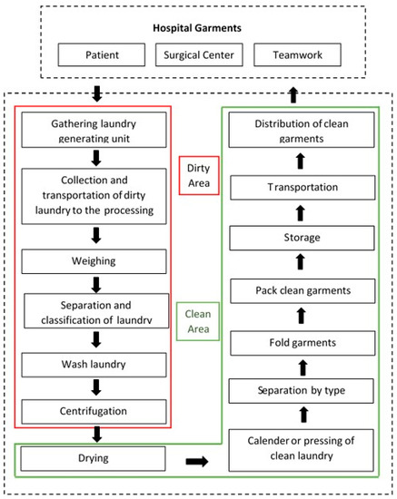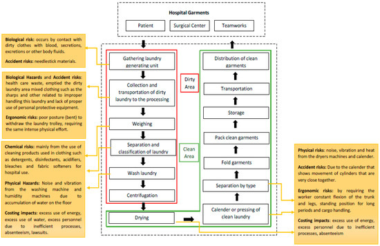 Hospitals are typically considered unhealthy places and, often, due to concern for the quality of service and the safety of users, they neglect the occupational hazards to which workers are exposed [27,38]. According to the Organic Law of the Brazilian Health, the prevention of occupational diseases can add value to humans. According to Figure 1, hospital laundry services aim to transform all the dirty or contaminated clothing used in the hospital into clean clothes through their collection, separation, processing, manufacture, repair, renovation, supply, and distribution [14,39]. The processing of the clothes should be carried out so that they do not pose a contamination threat to vehicle users and workers [40,41].