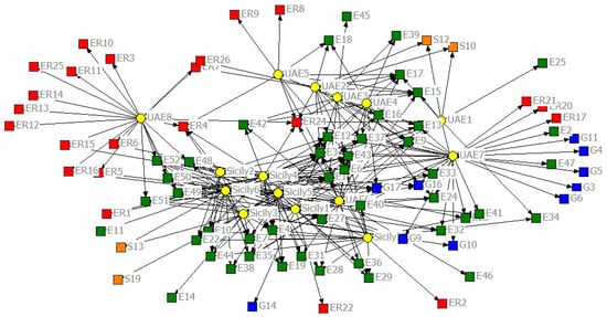 Graph of the affiliation network in the sample of organic farms that joined the measurement of sustainability with SAFA–FAO in the UAE and in Sicily. Italy (2017). The yellow graphic elements indicate the farms (actors) and the colored graphic elements indicate the events (responses related to the sustainability macro-theme).