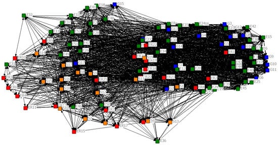 The intention was thus to take into account the ability of the overall network to facilitate access to all of the knowledge assets regarding sustainability contained within it. Another relevant indicator is the density of the network [], which measures the number of relationships within the network as a proportion of those that, given the number of nodes, could potentially exist. In particular, the degree of density (which assumes values of between 0 and 1) can be defined as:
