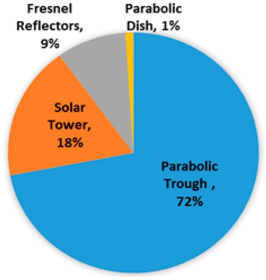 Solar energy technology can provide approximately 7% of the projected total electricity needs of the world by 2030, and 25% by 2050 []. Numerous CSP plants have been constructed, 68 of which are currently operating and producing 4569.55 MWe. Moreover, 28 other CSP plants are being built, and they are projected to produce 2313.5 MWe. An additional 41 stations are planned to be built in the future, and expected to produce 6831.08 MWe. Table 1 lists the data about different types of CSP plants worldwide that have been built, are being constructed, and that are being planned to be built []. Parabolic trough technology is the most mature CSPPs design, and solar tower technology ranks second (Figure 1).