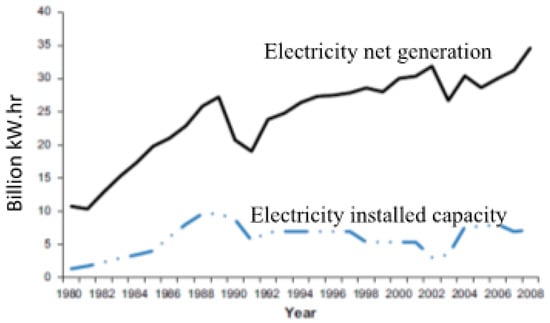 Net electricity generation (conventional thermal electricity and hydroelectric power) has expanded from 12.86 billion kWh in 1980 to 34.6 billion kWh in 2008; by contrast, net electricity consumption (electricity losses, electricity export, electricity imports, and net generation) has expanded from 10.167 billion kWh to 33.5 billion kWh. The installed electric capacity has expanded from 1.3 GWe in 1980 to 7.2 GWe in 2008 (Figure 3). Hydroelectric power is approximately 13% of the total installed power for electricity generation in Iraq. Fossil fuel power stations include steam technology, gas stations, and diesel stations []. The consumption and production power in Iraq is shown in Table 7.