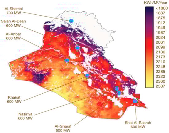 One of the most important concerns for the Iraqi electricity sector is with regard to satisfying electricity demands with a constant and persistent power supply. Iraq has excellent solar resources. Although the finest solar irradiance in the Middle East is found in the south, such as in Saudi Arabia and Yemen, the standard solar irradiance in Iraq is the same as that in North Africa. Iraq has a research history of using solar power (which has been reduced considerably over decades of wars and sanctions). At present, solar research activities are supported by the MoE and the Ministry of Science and Technology. The MoE has many off-grid solar research stations, with a few generating tens of megawatts of power. Regardless of the power of the resource, grid-connected solar electricity generation via PV or CSP remains a highly priced alternative, in contrast to fossil fuels []. Iraq exhibits excellent solarity, ranging from 1800 kWh/m2/year to 2390 kWh/m2/year of direct normal radiation [], which brings Iraq to the forefront of countries that can produce electricity by using solar energy. Similar to other countries, the significance of renewable energy resources, e.g., solar energy, has developed in Iraq []. Iraq is forecast to become one of the richest countries in renewable energy resources.