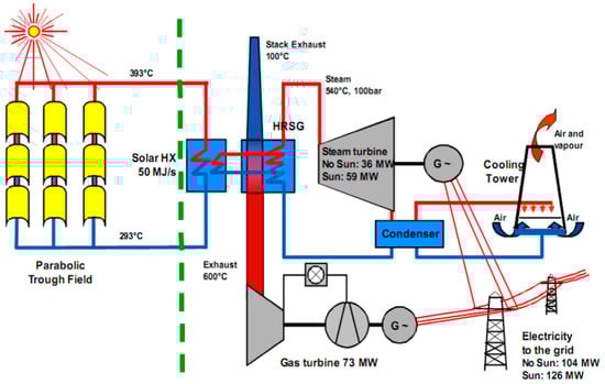 The proposed plants can be redesigned to operate in connection with parabolic troughs or solar power towers, in the manner of a solar–thermal combined cycle system. The Ain Beni Mathar Thermo–Solar Combined Cycle Power Plant in Morocco, and the Kuraymat Combined Power Plant in Egypt (Figure 5), may be adopted as reference techniques to increase the efficiency of the plants, and reduce fossil fuel consumption, emissions, and operational costs.