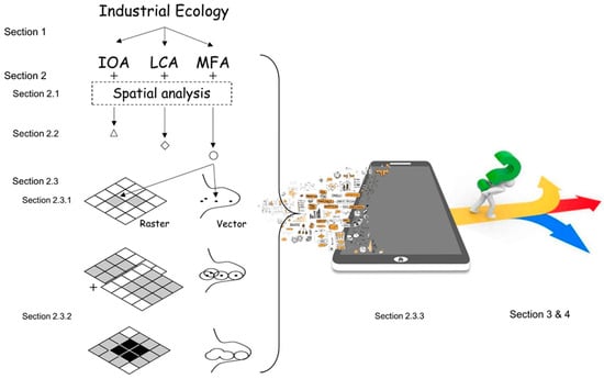 Fortunately, recent advances in spatial analysis allow us to analyze, diagnose, and model spatial dependence easily in industrial ecology. Previous reviews integrating spatial analysis into industrial ecology studies focused on specific topics in industrial symbiosis [8] and urban mining [11]. Here we further introduce the assumptions and methodologies of spatial analysis into typical tools in industrial ecology and propose a framework integrating them in detail. We provide an introduction of spatial analysis first (Section 2.1), and then try to identify the relationship between spatial information and industrial ecology tools (Section 2.2) and explain how to analyze industrial ecology topics (i.e., material stocks and flows) with spatial perspectives (Section 2.3). Three contributions were found to improve the performance of material stocks and flows analyses, they are data structure improvement (Section 2.3.1), spatial demonstration and analysis (Section 2.3.2), and finally building dynamic and spatially explicit models (Section 2.3.3) (Figure 1). In Section 3 and 4, we discuss limitations in current methods, and explore future directions (Figure 1).