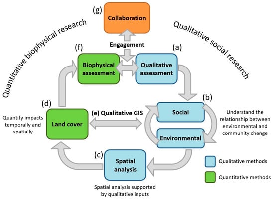 Figure 1 represents our conceptual model for linking quantitative and qualitative environmental and social data. Starting from the top right, qualitative social research is used to develop an understanding of an ecologically embedded human experience (Figure 1a). An initial output is to establish the relationship between environmental and community changes (Figure 1b). Ethnographic research can be used to characterize livelihood activities or to build a deep knowledge of how environmental degradation from mining impacts livelihood strategies [34,54,55]. These information sources can be used to drive the development of spatial data (e.g. through the creation of research questions) to provide another opportunity to build understanding. From here, spatial analyses provide spatial and temporal quantitative data (Figure 1c). A key output from the spatial analysis is land cover classifications informed by, and created in response to, categories developed through qualitative research (Figure 1d). Integration of the land cover data (and other spatial data) occurs through qualitative GIS methods such as a geo-narrative or geo-ethnography (Figure 1e). For example, the use of a time series of land cover change to support and triangulate local community accounts of mine impacts over time. Finally, these spatial data are used in conjunction with biophysical assessments, such as field assessments of water quality (Figure 1f). The choice of biophysical assessments is, to some extent, driven by the qualitative data such as qualitative interviews with local community members to identify specific locations for water quality assessments. Both quantitative and qualitative social data can be used to inform hypotheses, validate environmental data, and identify the types of environmental data that need to be gathered for biophysical assessments.