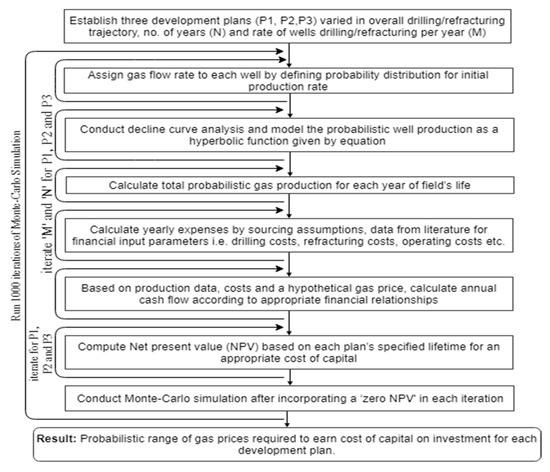 As objective of the study is to economically analyze the Bowland shale and to achieve so, it is intended to work out a range of gas prices that could earn at least cost of capital on investment in Bowland shale development. This is accomplished by establishing three different development plans followed by development of a probabilistic financial model that would output the distribution of gas prices. A flowchart (Figure 1) illustrates steps and their sequence to build such a financial model. Based on this model, firstly desk-based research is conducted to source relevant and reasonable assumptions for each parameter which are elaborated and justified further in the study. Secondly, the sourced data and assumptions are analyzed and manipulated for the use of model. As the uncertainties surround each physical and economic parameter involved in financial model, therefore a choice of probabilistic model was prioritized over a simple deterministic model.