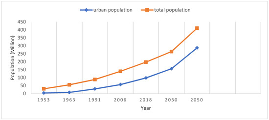 As a result of changing global urban lifestyle, the amount of municipal solid waste in cities is growing rapidly, exceeding the rate of urbanization itself [57]. This correlates the fact that today’s 3 billion urban residents currently generate 1.3 billion tons of solid waste per year at the rate of 1.2 kg/person/day as against 0.68 billion tons/year generated at the rate of 0.64 kg, a decade before now [16,57]. Moreover, by 2025, number of people living in urban cities is likely to increase to 4.3 billion and would be generating 2.2 billion tons of waste per year at the increased rate of 1.42/capita/day [16]. In agitation, the municipalities and urban cities have grown rapidly with the pace of urbanization in Nigeria showing extraordinary high rate of 5–10% per annum on average [80]. Nigeria’s urban population grew from 3.5 million people in 1950 to 68 million in 2010 and is projected to hit 287 million by 2050 [81]. As of 1995, Nigeria had barely 7 cities with a population of over 1 million; 18 cities had more than 500,000 people; 36 with over 200,000; and 78 with more than 100,000. By, 2020 it is expected that the cities with populations of 500,000 and 200,000 respectively will be 36 and 680 respectively, assuming an annual urban growth rate of 5% [82].
