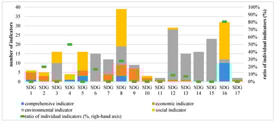 For each sustainable development goal, the number of indicators varied considerably: while two indicators belonged to the Sustainable Cities and Communities (SDG 11), two to the Partnership for the Goals (SDG 17), 39 indicators belonged to the decent work and economic growth (SDG 8). It was found that there were seven SDGs (41%) that had less than ten GRI indicators, 10 to 20 indications were linked to six goals, and at four goals more than 20 indicators were identified. There were 10 SDGs that had an indicator which wasn’t found at other goals, while for two SDGs the ratio of individual indicators was less than 10%. Most of the individual indicators belonged to Peace, Justice, and Strong Institutions (SDG 16), but their proportion is also significant in the case of Quality education (SDG 4) (see Figure 1).