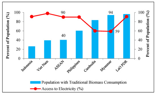 Traditional biomass consumption (2015) and access to electricity (2016) in the Selected ASEAN Countries [15].